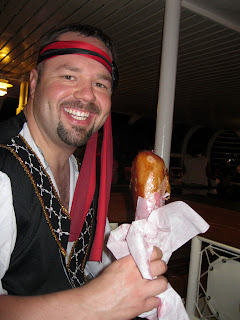 In my first post about our cruise I mentioned how much I love my husband because he wore the Mickey Ears...well heres another example of him taking one for the team. He was in full pirate gear too. At first he felt funny but by the end of the night he joked that his elastic loose pants were so comfortable that he wanted to wear the entire outfit to Thanksgiving.
